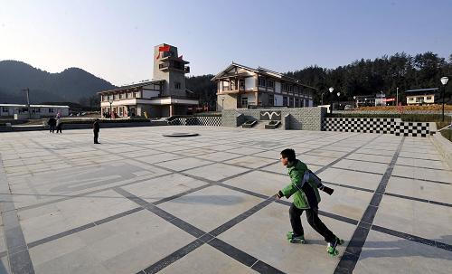一位居民在新建的北川縣香泉鄉廣場上溜旱冰(1月14日攝)。新華社記者朱崢攝