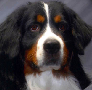 伯恩山犬是三色犬。基本色為深黑色。斑紋顏色為豐富的鐵銹色和清澈的白色。對稱的斑紋比較理想。鐵銹色出現在眼睛上面、從面頰延伸到嘴角、胸部兩邊、四條腿及尾巴下面。臉上有白筋、口吻有白條。白色斑紋還出現在前胸。尾巴尖也是白色的。白色足爪比較理想,但白色不能延伸到腳腕。除上面描述以外的斑紋都屬于缺陷,并根據背離的程度進行扣分。白色的腿和白色領圈屬于嚴重缺陷。基本色不是黑色屬于失格。