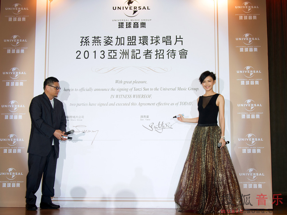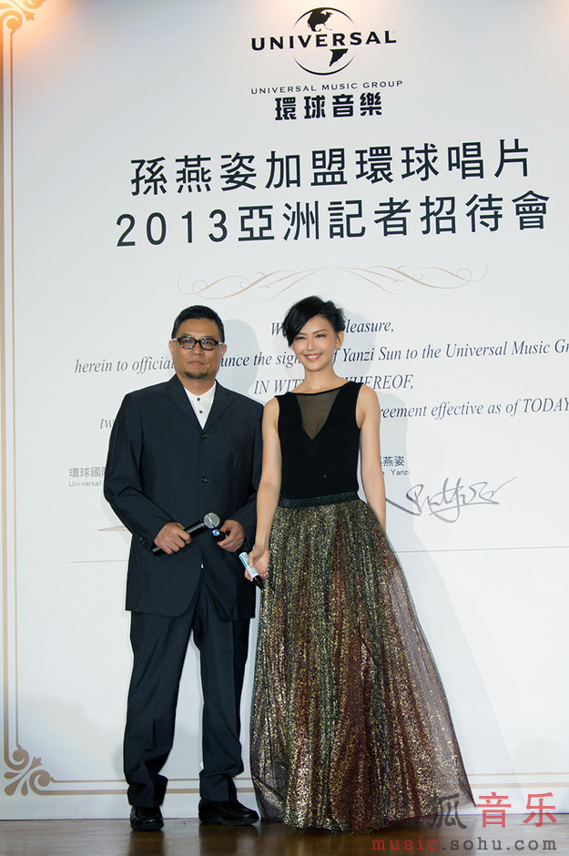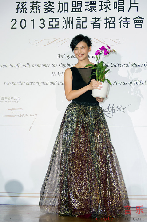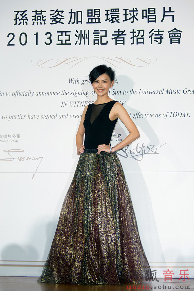 昨天(9/3)在新加坡盛大舉行「孫燕姿加盟環球唱片2013亞洲記者招待會」,來自各國的貴賓、媒體朋友們,一同見證了華語樂壇最盛大的回歸!為隆重其事,環球國際唱片除了選在孫燕姿的家鄉新加坡舉行盛大儀式,更精心挑選于當年燕姿舉行婚禮的Capella卡佩拉酒店,特別安排她乘坐有”頂級名車界藝術品”之稱的Maserati瑪莎拉蒂跑車進場,義大利頂級跑車整臺開進會場,非常壯觀特別,也呼應她在樂壇獨一無二的地位與魅力!孫燕姿一襲華服翩然現身,大秀美背,金蔥紗裙里的美腿若隱若現,大展好身材。為宣告全面回歸華語樂壇,特別準備巨型證書,由環球國際唱片大中華區總裁暨執行長Sunny張松輝先生,和孫燕姿共同在證書上簽名,為雙方在華語樂壇的合作訂下情意堅定久遠的盟約。