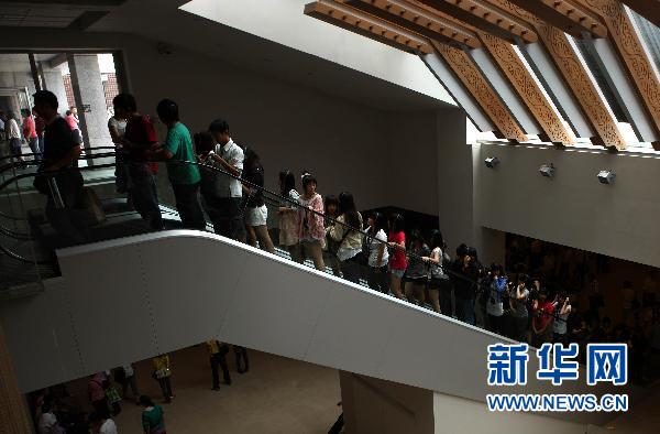 7月2日,游客乘坐電梯準備開始參觀。臺北故宮博物院藏品共約60萬件,分為書法、古畫、碑帖、銅器、玉器、陶瓷、文房用具、雕漆、琺瑯器、雕刻、刺繡及緙絲、圖書、文獻等14類。博物院經常維持有5000件左右的書畫、文物展出,并定期或不定期舉辦各種特展,每天都吸引眾多參觀者。新華社記者 費茂華 攝