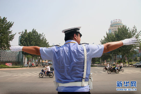 7月6日,山東日照一名交警頂著高溫在市區(qū)路口指揮交通。當(dāng)日,山東氣象臺(tái)將高溫黃色預(yù)警信號(hào)升級(jí)為高溫橙色預(yù)警信號(hào),最高氣溫突破40攝氏度。新華社發(fā)(趙希珠 攝)