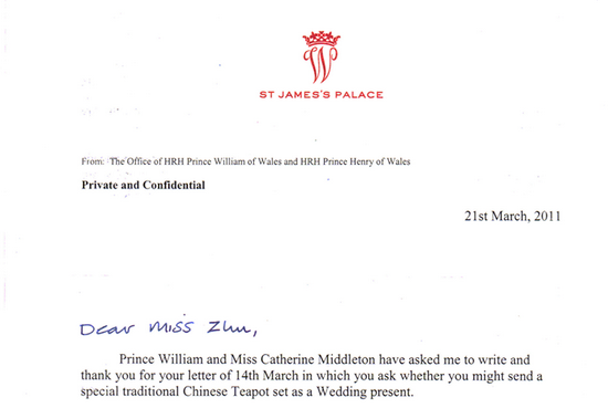 回信中寫道(譯文大意):朱小姐,威廉王子和米德爾頓小姐囑咐我寫信給您致以謝意,感謝您于3月14日來信表示您可能會(huì)制作一套特別的具有中國傳統(tǒng)特色的茶具作為結(jié)婚賀禮。