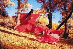 張曼玉在電影《英雄》中除了跟梁朝偉于九寨溝瀑布前比劍外,還跟章子怡在內蒙古一處遍地黃葉的胡楊林中比武。雖然誰勝誰負,要在電影中才有分曉,但單論畫面,意境就極之凄美。