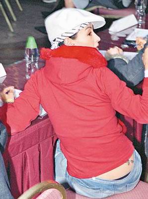 張柏芝為忘失戀傷痛,在腰間紋了新紋身。有見(jiàn)王菲重戴情侶鏈,柏芝昨日穿上超低腰褲,公開(kāi)展示“情逝紋身”示威!