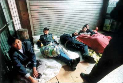 當天,黑黑瘦瘦的高峰在騰文驥導演的《末代皇妃》中飾演一個日本鬼子,在一個雕梁畫柱的老藥鋪前,記者向高峰說明了來意,高峰同意拍完戲后帶記者到北影門前的小樹林和過街天橋上感受群眾演員“睡街”生活。同時高峰高興地告訴記者,他今天晚上的鏡頭是穿著日本細菌部隊的防化服,隨軍從著火的大街上跑過,雖然只有20塊錢,但拍戲的感覺很讓他興奮。