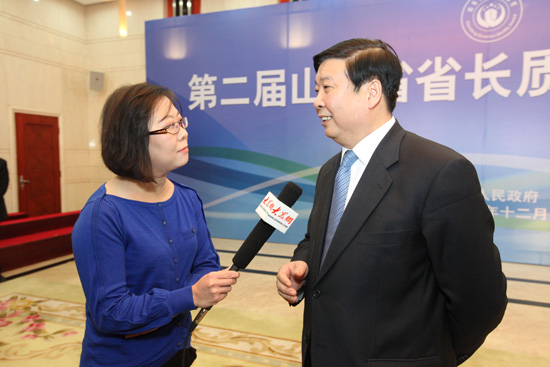 上午10:30許,在山東大廈濱州廳,與獲獎企業代表合影完畢,大明省長一眼認出了在一旁等候的大眾網記者,并愉快地同記者打起招呼:“你好,你好……”在省長熱情地招呼中,大眾網記者對省長進行了采訪。