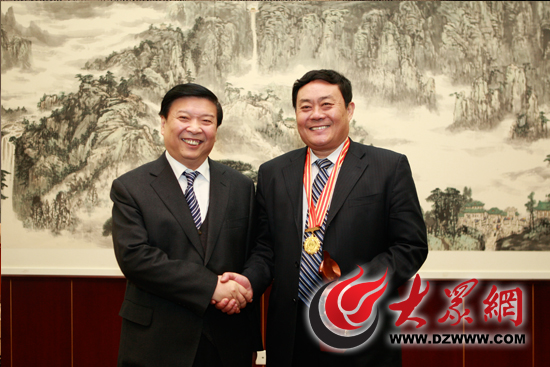 山東省省委副書記、省長姜大明與山東力諾瑞特新能源有限公司總經理申文明親切握手