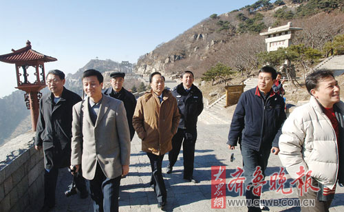 南線考察采風團的媒體老總和相關負責人,28日登上了五岳之尊的泰山,“一覽眾山小”。天公作美,岱頂之上,天空湛藍,陽光燦爛,泰山風光一覽無余。泰山石敢當、碧霞元君祠、封禪文化、摩崖石刻書法……泰山深厚的文化底蘊,讓老總們感嘆不虛此行。在天街、拱北石、玉皇頂等岱頂的標志性景點,老總們拍照留念。江西日報副總編輯王暉說,以前來過山東,但一直沒有機會登泰山,這次了卻了一個心愿。