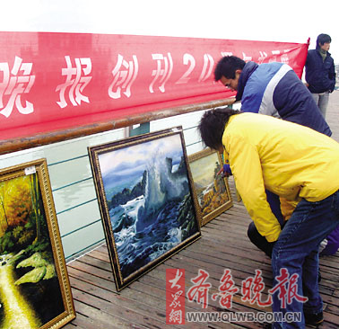 24日在聊城水城明珠劇場外,來自聊城大學(xué)藝術(shù)學(xué)院的十多位大學(xué)生,自發(fā)地把他們平日精心創(chuàng)作的50多幅油畫作品擺出來,共同祝賀晚報的生日。