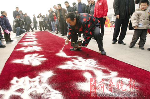 “賀齊魯晚報(bào)創(chuàng)刊二十周年!齊魯青未了,晚報(bào)達(dá)民意。”24日上午,在水城明珠劇場前的廣場上,聊城民間藝人魏翌海現(xiàn)場表演了他的沙書絕活,21個(gè)沙書字一氣呵成,在十米紅布上排列得整整齊齊。沙書寫完,沙盤的“沙子”恰好全部用光。魏翌海告訴記者,在布上走一遍是為了測量字間距,而旋轉(zhuǎn)是為提精神,他手里的這盤“沙”由6斤玉米糝兒和2斤鹽調(diào)配而成,為了現(xiàn)場表演能夠成功,他提前進(jìn)行了精心準(zhǔn)備。