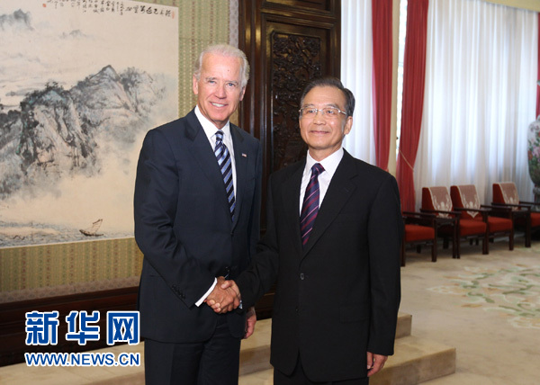 8月19日,中國國務院總理溫家寶在北京會見美國副總統拜登。新華社記者丁林攝