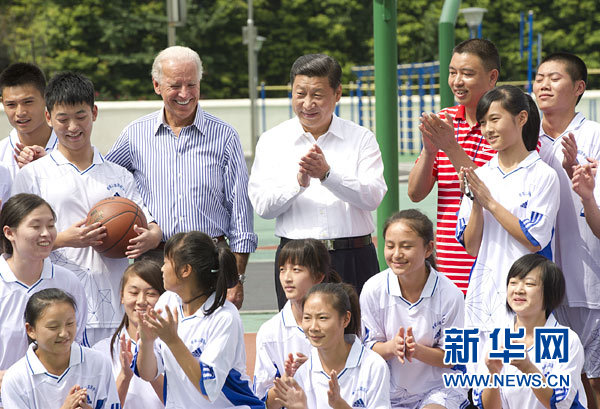 8月21日,國家副主席習近平同正在中國進行正式訪問的美國副總統拜登在四川省都江堰市共同參觀地震災后重建項目和都江堰水利樞紐。這是習近平同拜登參觀青城山高級中學時,觀看了校男女籃球隊訓練,并與隊員親切交流并合影。 新華社記者黃敬文攝