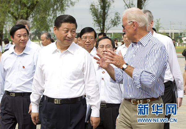 8月21日,中國國家副主席習近平同正在中國進行正式訪問的美國副總統拜登在四川省都江堰市共同參觀地震災后重建項目和都江堰水利樞紐。新華社記者黃敬文攝