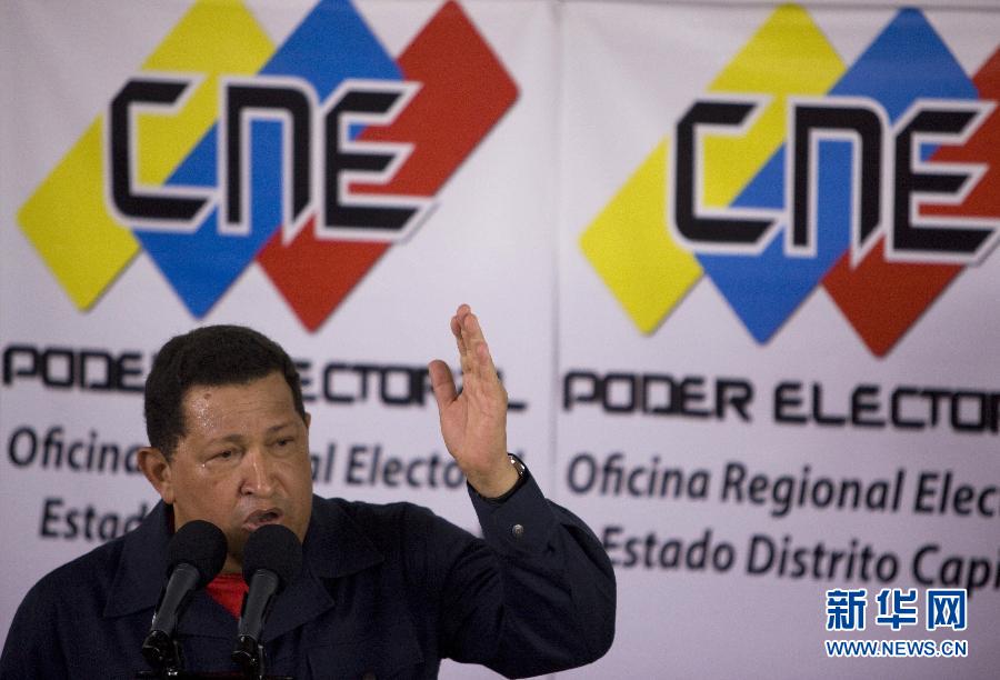 委內(nèi)瑞拉全國(guó)選舉委員會(huì)7日宣布,現(xiàn)任總統(tǒng)查韋斯以54%的得票率贏得委內(nèi)瑞拉總統(tǒng)選舉。這是查韋斯在委內(nèi)瑞拉首都加拉加斯出席新聞發(fā)布會(huì)。(10月7日攝) 新華社發(fā)(戴維·德拉巴斯攝)