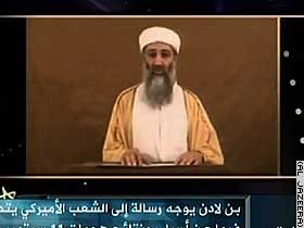 2003年9月10日:兩年來本·拉登第一次出現在錄像帶上。錄像畫面是拉登與其副手扎瓦希里在山區行走。在伴隨錄像的兩段錄音中,拉登對“9·11”事件造成的巨大災難表示幸災樂禍,同時也提及了“9·11”事件中的5名劫機者的名字。扎瓦希里也威脅將有更多針對美國的襲擊。