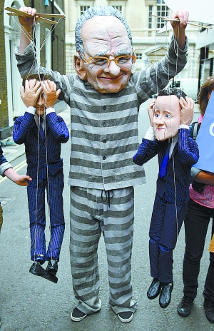 倫敦示威者在默多克住所外,頭戴面具、手持卡梅倫肖像的吊線玩偶,以示抗議。