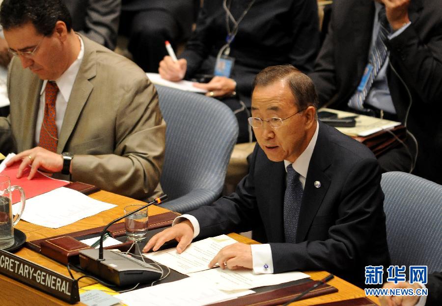 8月26日,在紐約聯合國總部,聯合國秘書長潘基文(右)在安理會會議上發言,強烈譴責當天早上發生的聯合國駐尼日利亞機構大樓爆炸事件。位于尼日利亞首都阿布賈的聯合國機構大樓當地時間8月26日遭汽車炸彈襲擊,迄今爆炸已造成至少10人死亡,多人受傷,目前仍有許多人被困在聯合國大樓內等待援救。新華社記者 申宏攝