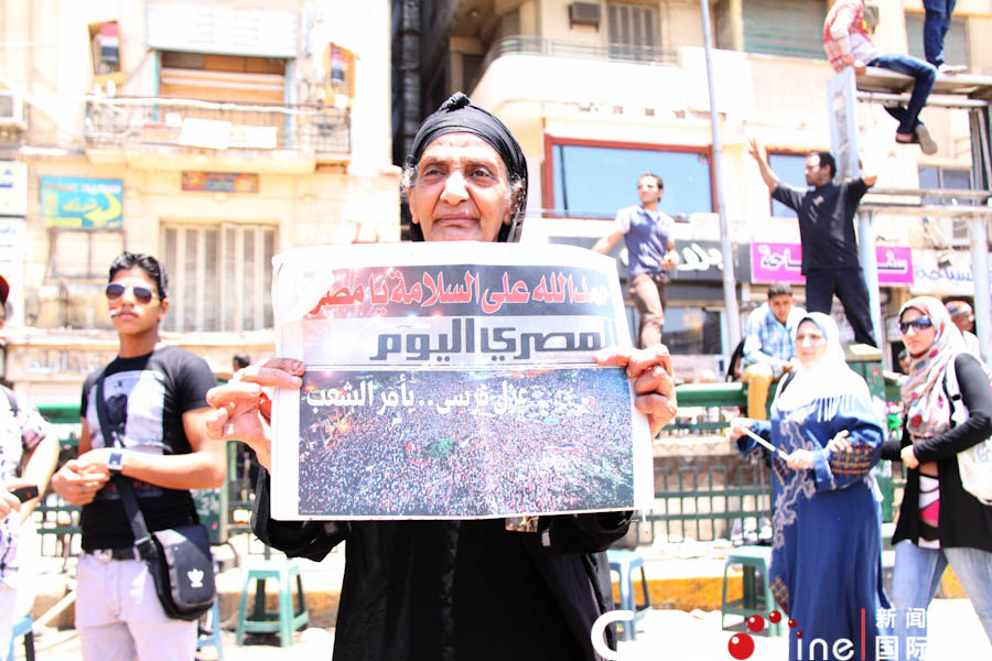 在激昂的人群中,一名年長(zhǎng)的穆爾西反對(duì)者向記者展示當(dāng)天的報(bào)紙,報(bào)紙頭版寫著“以人民的命令拘押穆爾西”。攝影:張一夫