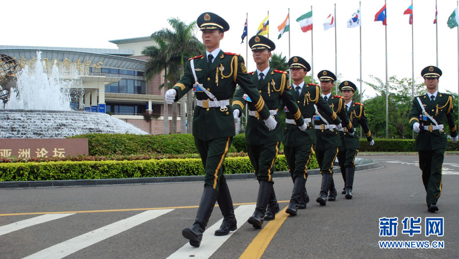 4月10日,武警戰士在博鰲上崗執勤。當日,擔負安保任務的武警海南省總隊2000余名執勤官兵分批入駐三亞、博鰲宿營地,開始在各自崗位上執勤,切實保障即將召開的博鰲亞洲論壇2011年年會順利進行。新華社記者 傅勇濤 攝