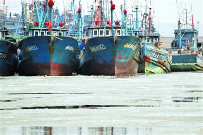 漁船被冰封港灣