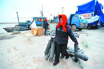 記者隨后驅(qū)車又趕到膠州營海碼頭,遠遠地就看到成片的漁船停靠在港灣里,大片的海面已經(jīng)被薄冰覆蓋,靠近岸邊的冰層足有六七厘米厚。漁港里平日繁忙的景象不見了,零星有幾個漁民在清理船艙。由于岸邊海風(fēng)太大,漁民老鄭一會用雙手捂著耳朵,一會用嘴哈氣給手取暖。他告訴記者,從四五天前港灣里就出現(xiàn)了薄冰,這兩天冰層開始加厚,最寬處已經(jīng)延伸一公里多了。“這幾天氣溫太低,港灣里的海水比較淺,加上流動性太差,很容易就結(jié)冰了。”老鄭說,漁港里停泊著200多艘漁船,隨著氣溫逐漸降低,冰層會越來越厚,冰面也會日益增大,這些漁船會在此冰凍一個冬天。山東漁業(yè)船舶檢驗局的相關(guān)負責(zé)人告訴記者,營海碼頭等附近幾個碼頭的漁船有上千艘,從11月中旬就陸續(xù)靠岸休整,隨著冰凍期的來臨,這些漁船將在碼頭里度過一冬,“冰塊越來越多,漁船出海容易受損,人也容易出事。”