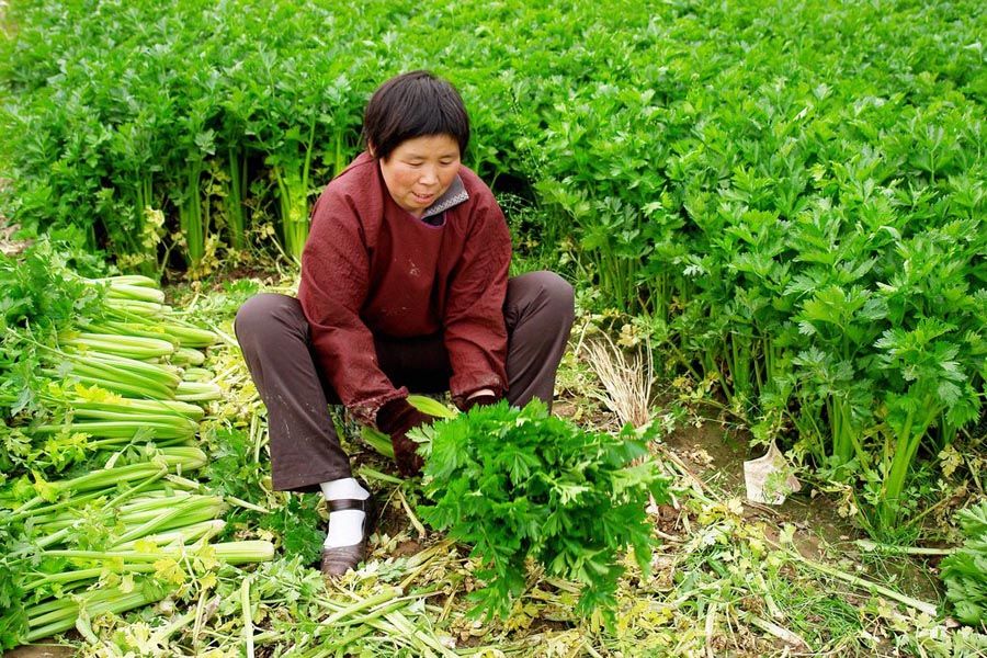 4月21日下午,河南中牟縣明山廟村民段大姐在芹菜地里收成熟的芹菜。眼下正值芹菜大量上市的季節(jié),河南省中牟縣的芹菜獲得了大豐收,而品相好的芹菜收購價每斤1毛,今年每畝芹菜要賠1000多元。品相差的每斤只有5分錢,則被種植戶丟棄到河中或喂雞鴨。