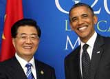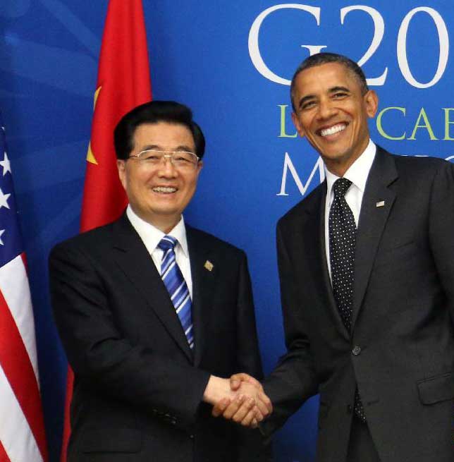 中國國家主席胡錦濤19日在墨西哥洛斯卡沃斯會(huì)見美國總統(tǒng)奧巴馬。這是奧巴馬就任美國總統(tǒng)后,中美最高領(lǐng)導(dǎo)人的第十二次會(huì)面。