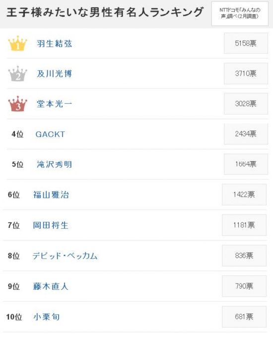 日本媒體于2月15日~22日就“像王子一般的日本男星”進行調查,共獲得26714張投票,結果在索契冬奧會奉獻驚艷表演的羽生結弦力壓一票娛樂圈男星,排名首位。