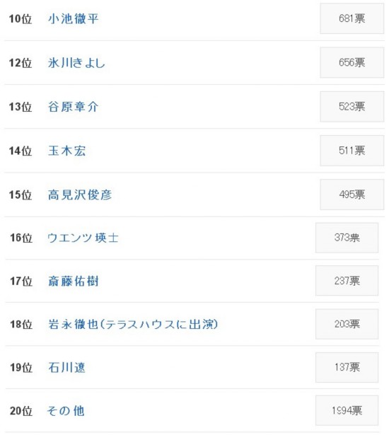 排在第二位的是,出演過《相棒》、《半澤直樹》等熱門日劇的男星及川光博。雖然已經年過四十,卻依然魅力不減。他長相清秀,舉手投足間流露出嫵媚之態,打扮也常走華麗路線,是有名的中性風藝人。及川以其自戀性格和貴族氣質贏得了大量的擁躉。他一出道后就被譽為“王子”,成為眾多少女的夢中情人。數年后,“王子”的頭銜讓給堂本光一之后,他仍不時以“原王子”自稱。