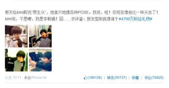 盡管《爸爸去哪兒》第一季已經(jīng)收官數(shù)月,但大家對(duì)王詩(shī)齡、Kimi、石頭、天天、森碟的關(guān)注一點(diǎn)都沒(méi)有減弱。相比之下,張亮和寇靜更注重降低天天的曝光率,除了春游、游泳一般不會(huì)曝光天天,其次是林志穎家Kimi也少有曝光。今天,林志穎發(fā)了一組Kimi變發(fā)型的照片,林志穎本信心滿滿說(shuō)Kimi這下和他頭發(fā)一樣,可是Kimi居然得意得說(shuō)自己是“李敏鎬”。小編細(xì)看小Kimi還真像李敏鎬呢!(丹雅)