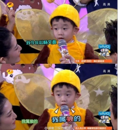 楊威兒子在參加《快樂大本營》時,當主持人要求小家伙做自我介紹時,小家伙毫不怯場奶聲奶氣的說到:“我今年叫楊文昌,我屬狼。我爸爸姓楊,我媽媽姓楊,我也姓楊,所以我小名叫楊陽洋。”那“條理清晰”的介紹方式惹得觀眾捧腹大笑,而他那呆萌可愛的樣子萌翻眾網友。