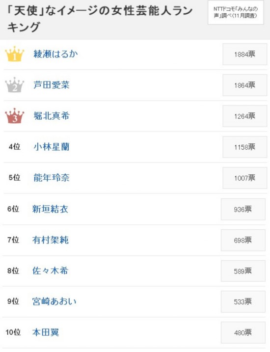 其實(shí)在三次元的世界里,還有很多清新脫俗的女星也給人留下天使般的印象。日本媒體此前就“給人天使印象的女星”進(jìn)行調(diào)查,共收到12964張投票。