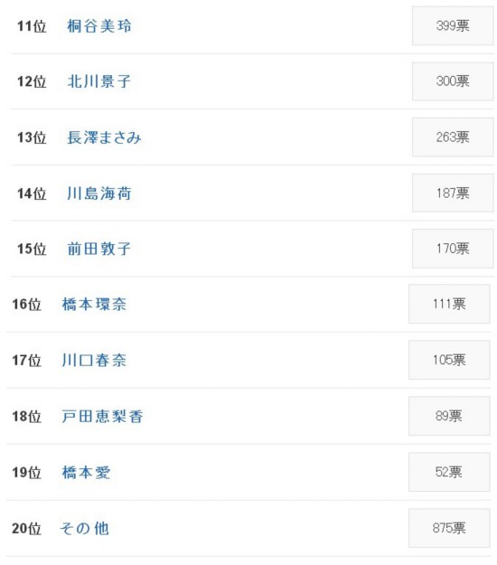 結(jié)果剛剛度過(guò)29歲生日的綾瀨遙排名首位,以微弱優(yōu)勢(shì)領(lǐng)先人氣童星蘆田愛(ài)菜。因?yàn)閮扇耸遣煌挲g段的妹子,所以不太好比較。但不能否認(rèn)的是,綾瀨遙的“天然呆”和蘆田愛(ài)菜的“自然萌”,都是征服粉絲的有力武器。具體榜單如下。