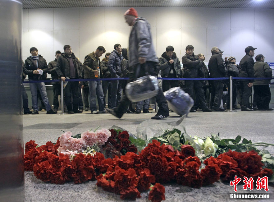 1月25日,俄羅斯多莫杰多沃機場大廳擺放鮮花哀悼在炸彈襲擊中喪生的遇難者。24日,俄羅斯莫斯科多莫杰多沃機場抵達大廳內發生自殺式炸彈爆炸。