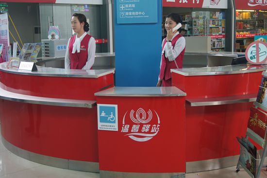 為了方便殘疾人旅客出行,車站還專門在站前廣場設置了3處殘疾人車位,1個殘疾人專用售票窗口,還在候車大廳服務臺一側新設低位服務臺一個,據介紹,這些都是專門服務殘疾人的人性化服務設施。 據工作人員介紹,所謂低位服務臺,因其位置較低,可更便殘疾人咨詢業務。