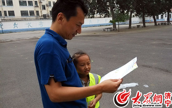 穿著熒光衣的小學生正在認真閱讀“平安濟寧 熒光童行”宣傳頁中的安全出行知識