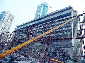 25日,樓前搭起了防護(hù)網(wǎng)。本報(bào)記者 李飛 攝