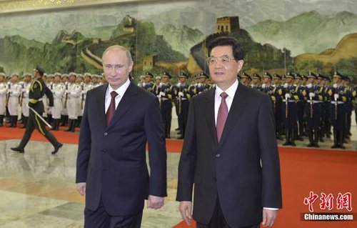6月5日,中國國家主席胡錦濤在北京人民大會堂舉行儀式歡迎俄羅斯總統普京訪華。中新社發 廖攀 攝