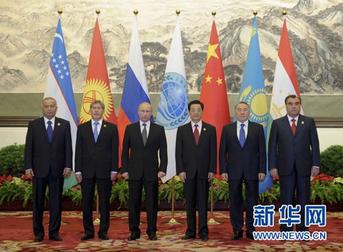 新華網北京6月6日電 (記者廖雷)上海合作組織成員國元首理事會第十二次會議小范圍會談6日在人民大會堂舉行。中國國家主席胡錦濤作為主席國元首主持會議。哈薩克斯坦總統納扎爾巴耶夫、吉爾吉斯斯坦總統阿坦巴耶夫、俄羅斯總統普京、塔吉克斯坦總統拉赫蒙、烏茲別克斯坦總統卡里莫夫出席會議。
