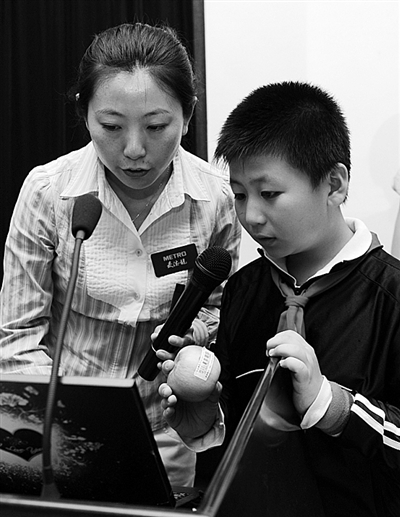 5月18日,北京西城區白紙坊小學的食品安全教育主題班會上,麥德龍工作人員正在為同學們現場演示食品可追溯系統。資料照片
