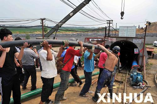 7月11日,救援人員在向井下運送管道。新華社記者 朱崢 攝