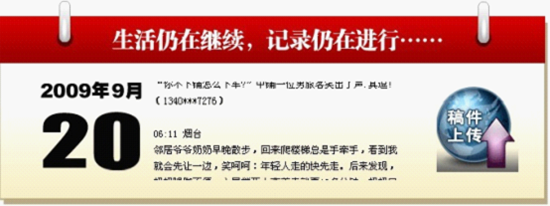 9月19日,記錄“中國一日”活動正式啟動,全媒體采訪中心分頭行動,進行視頻、圖文采訪,網友在論壇、博客、開心公社正式上傳作品,互動評論部提前約請的一大批公民記者也紛紛行動起來。正式審核完手機報后,我安排編輯上手機報讀者短信后臺整理“讀者的一天”。讀著編輯發給我的 “一天”,心中產生了一種平凡的感動。