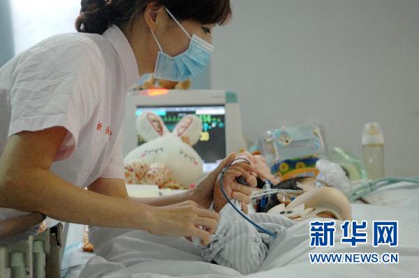 圖為7月11日,護(hù)士在重癥監(jiān)護(hù)室擺放好妞妞的右手。妞妞的手腳已經(jīng)有了不自主的運(yùn)動(dòng)。